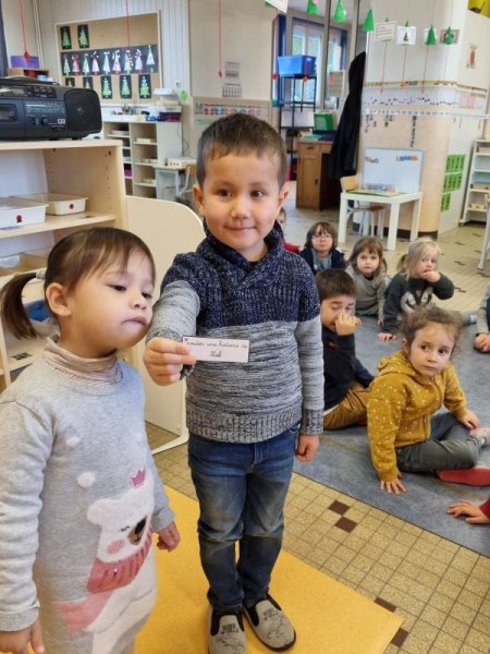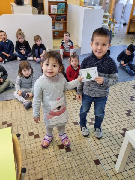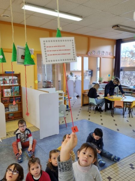 Nous avons ouvert deux cases. La case 1 contenait une devinette : “Je suis un arbre de la forêt. On me coupe au mois de décembre. On me décore pour préparer Noël.” Il s’agit bien sûr du sapin de Noël.