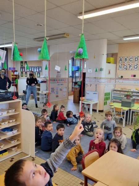 Ce matin, nous avons découvert le calendrier de l’Avent de la classe : des sapins suspendus, créés par les enfants.