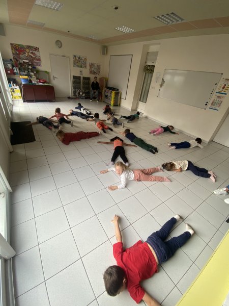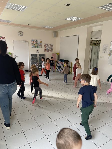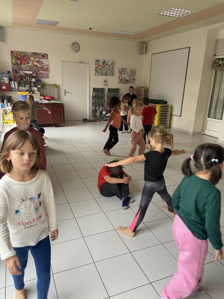 Les enfants ont appris à marcher sur la musique en prenant tout l’espace et à adopter une certaine position lorsque la musique s’arrêtait.