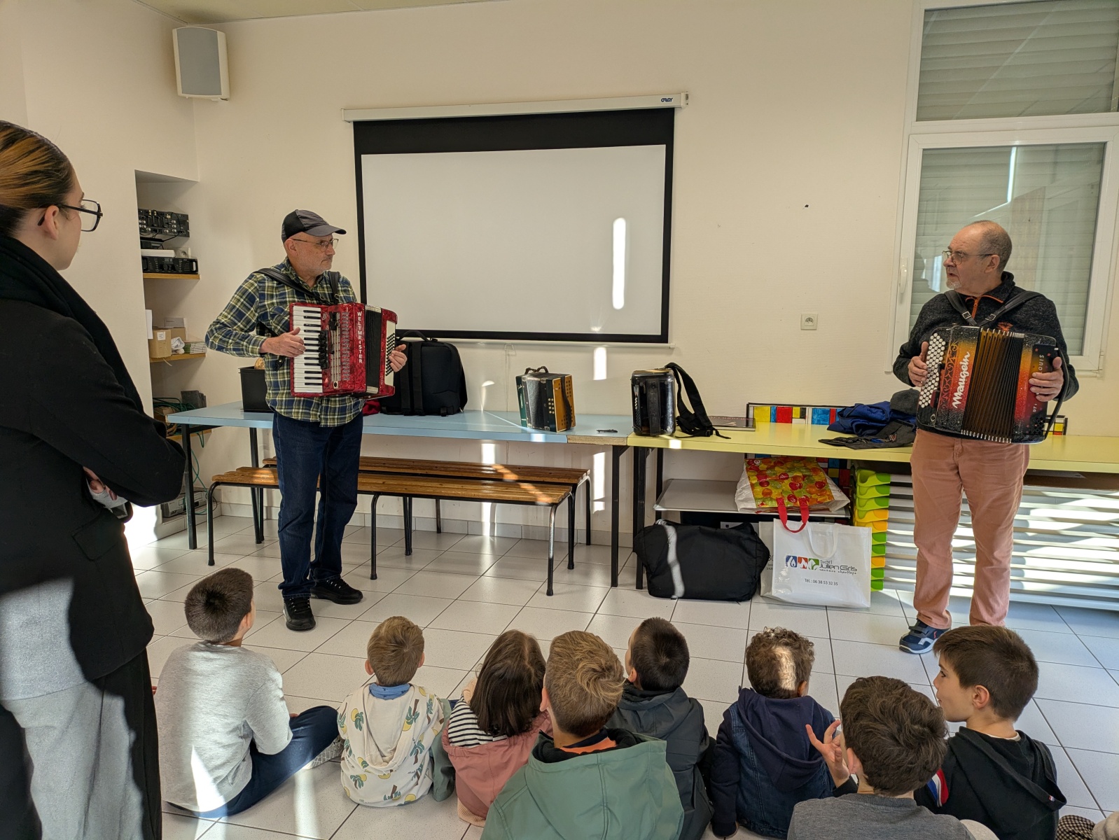 • découverte de l’accordéon. Un grand merci à nos 2 papis musiciens.