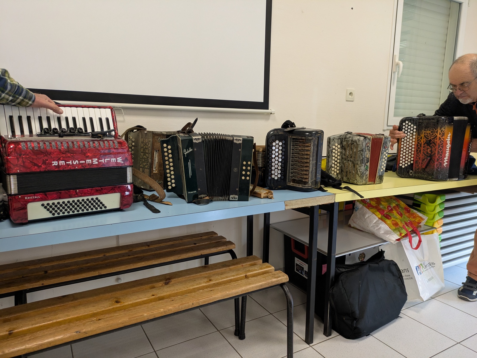 • découverte de l’accordéon. Un grand merci à nos 2 papis musiciens.