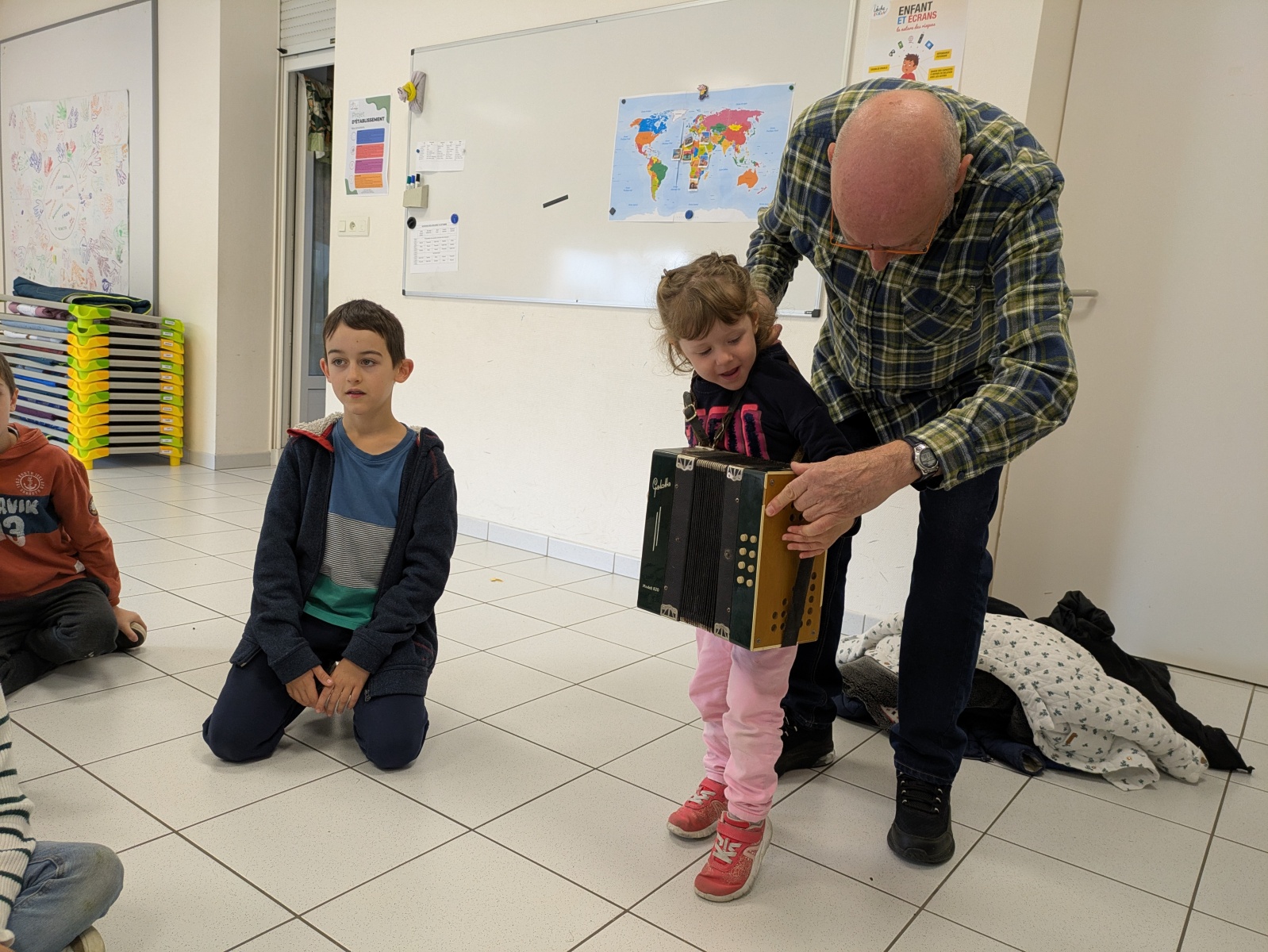 • découverte de l’accordéon. Un grand merci à nos 2 papis musiciens.